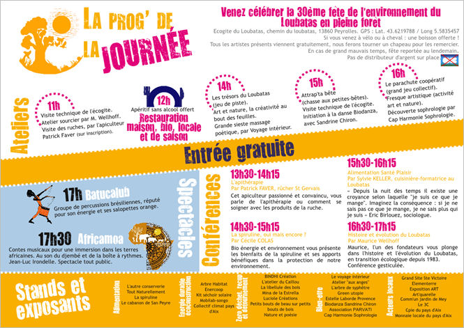 La fête de l’environnement est un événement incontournable du mois de septembre ! Il est organisé par le Loubatas, association d’éducation à l’environnement, le samedi 28 septembre de 11h à minuit à l’écogite du Loubatas, chemin du Loubatas à Peyrolles en Provence.