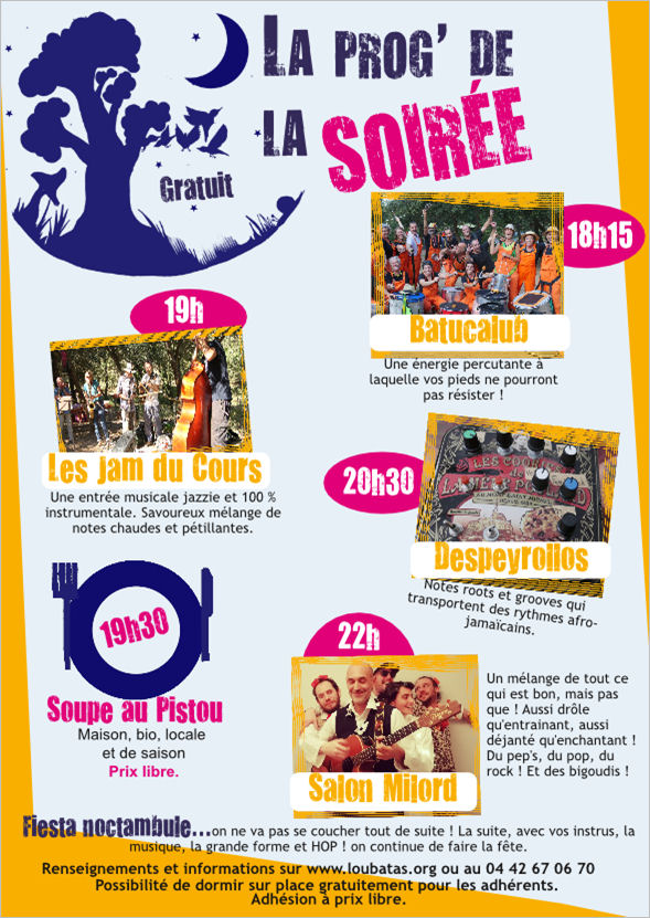 Une restauration faite maison vous sera proposée le midi et une soupe au pistou à prix libre sera servie le soir. Une buvette aux produits locaux sera accessible toute la journée et la soirée.