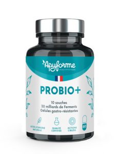 Probio+ est composé de dix souches probiotiques, dosées à 15 milliards de micro-organismes vivants par gélule. Ce complément alimentaire aide à rééquilibrer et à entretenir la flore intestinale, et à prévenir les troubles gastro-intestinaux comme la constipation et la diarrhée. Il peut également être utilisé en prévention de la « turista ».