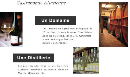 Une passion familiale, transmise de génération en génération, pour les produits de la région. Ainsi, au cœur d’un vignoble de 25 ha en Agriculture Biologique, la famille Meyer élève dans la meilleure tradition une gamme de vins d’Alsace de grande qualité et produit dans sa distillerie les alcools blancs typiquement alsaciens : quetsch, kirsch, mirabelle…