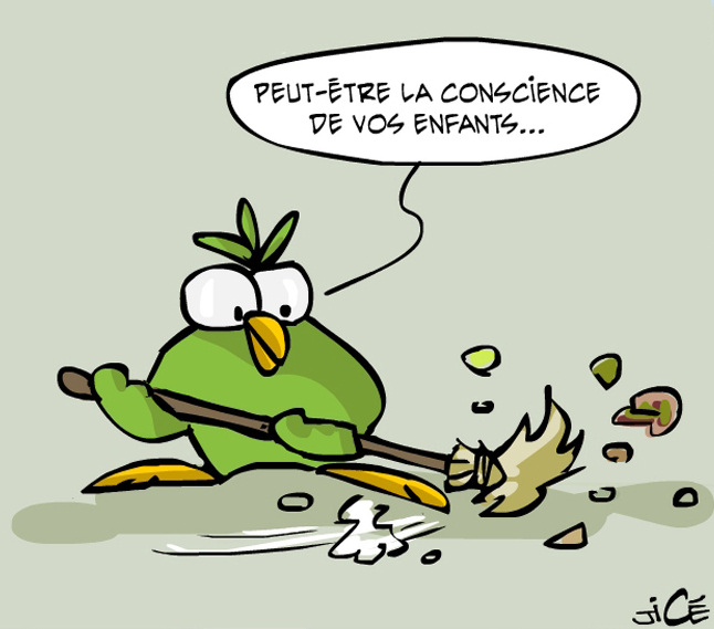 Leurs parents ne savaient pas qu’un sac en plastique met plus longtemps qu’une vie d’homme à se dissoudre dans la nature. Ils ne savaient pas qu’ils allaient transformer les terribles ours blancs en mendiants faméliques. Ils ne savaient pas qu’ils allaient manger des poissons farcis du plastique de leurs poubelles. Ils ne savaient que des sorciers inventeraient des pommes qui allaient empoisonner leurs paysans. Enfin, les hommes d’avant ne savaient rien, ou presque. Leurs dirigeants fous d’avidité étaient devenus malheureux et méchants. Ils avaient confondu le plus et le mieux. Mais les enfants que je voyais étaient différents. Ils étaient joyeux et gentils. Ils étaient déterminés et allaient arrêter de cultiver des pommes de sorciers qui empoisonnent des paysans et rendre leur majesté aux ours blancs. Vous verrez, bientôt, grâce à eux, plus personne ne mettra le feu à la forêt pour faire pousser de l’huile à fabriquer des shampoings. Plus personne ne jettera de papiers sales par la fenêtre de sa voiture et les chasseurs auront des pistolets à bouchon pour ne pas faire mal à mes copains les lapins.