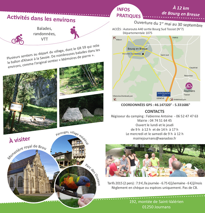 À cinq minutes de la sortie d’autoroute Bourg-en-Bresse Sud, niché dans la verdure à l’ombre de ses grands arbres, le camping de Journans invite au calme et à la sérénité et offre une vue imprenable sur le village, les vignes et la plaine bressane.