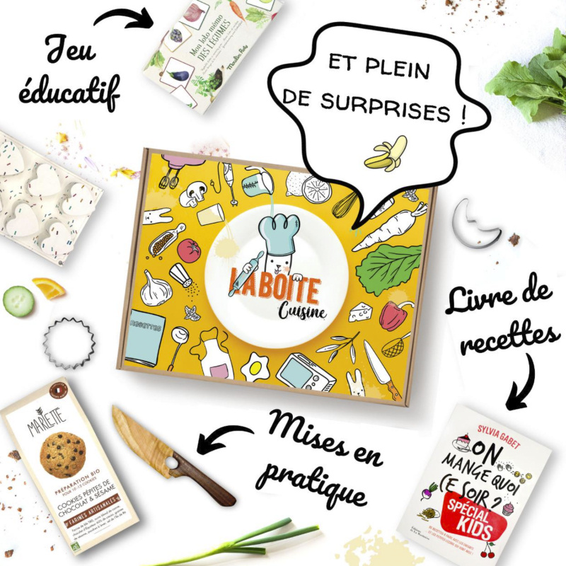 La première collection est dédiée à la cuisine, avec le lancement des boîtes cuisine afin d’aider vos enfants à comprendre les aliments et à les initier à l’art de bien manger. Savoir casser un oeuf, étaler de la pâte à tarte, suivre une recette, identifier les légumes de saison, respecter les consignes du chef (vous), doser et calculer les proportions, faire les courses, mettre la table, découvrir de nouvelles saveurs, développer le goût des bonnes choses, se faire du bien…