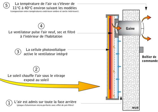 Chauffage et ventilation dans de grands locaux souvent mal isolés s’avèrent difficiles, voire impossibles. La récupération d’air préchauffé gratuitement par le soleil s’impose comme une solution évidente.
