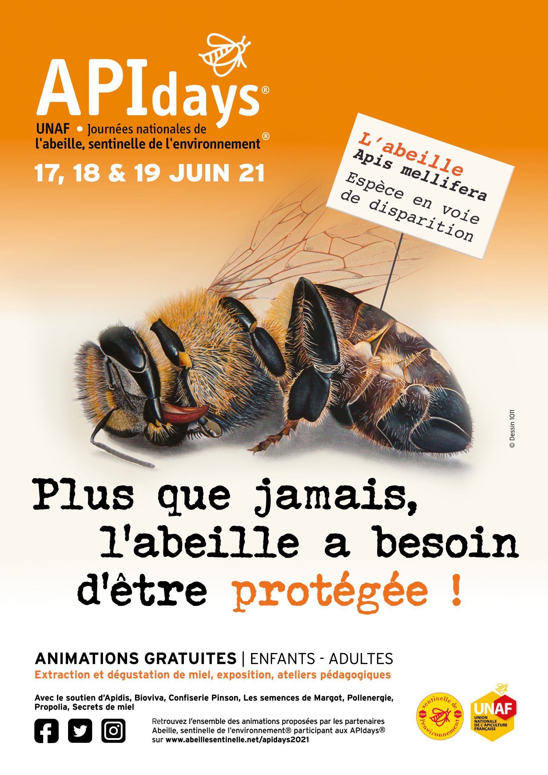 L’Union Nationale de l’Apiculture Française et des centaines d’apiculteurs français se mobilisent une fois encore, avec un dispositif adapté au contexte sanitaire, dans près de 60 sites, en métropole, Outremer et à Monaco. La thématique de cette nouvelle édition des APIdays® 2021 : « Plus que jamais, l’abeille a besoin d’être protégée ! »
