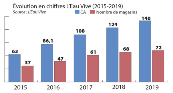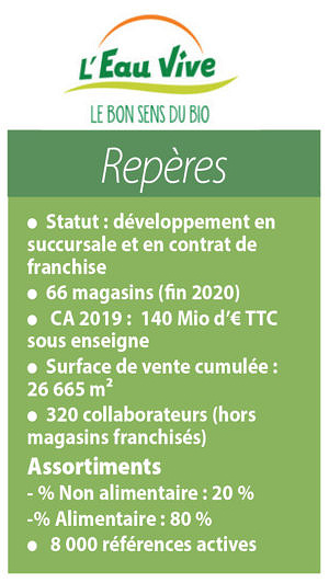 Pionnier de la distribution bio depuis plus de 40 ans, L’Eau Vive affiche un chiffre d’affaires de 140 millions d’euros TTC sous enseigne en 2019. Fort d’un développement soutenu, et notamment en franchise, cette PME familiale originaire du Rhône-Alpes s’installe dans les grandes agglomérations de France et vise les 100 magasins pour conforter son maillage national.
