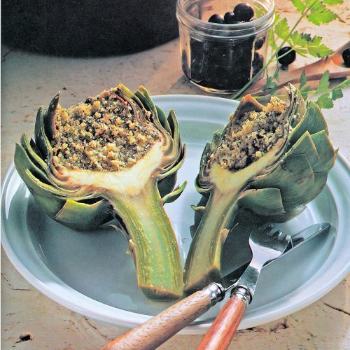 - Salez le milieu des artichauts ainsi que les feuilles tout autour, farcissez-les délicatement et resserrez les feuilles bien ensemble.