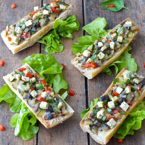 - Divisez la baguette en 2, puis recoupez-la en 2 pour obtenir 4 « tartines ». Passez-les au toaster, puis faites couler un filet d’huile d’olive sur chacune d’elles. Déposez ¼ de la poêlée de légumes sur chaque tranche, ainsi qu’¼ du tofu. Faites de même pour les 3 autres. Finissez en ciselant des feuilles de basilic sur les bruschettas.