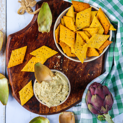 - Mixez jusqu’à l’obtention d’une consistance homogène. Laissez refroidir au réfrigérateur si besoin puis déguster avec les crackers ainsi que les feuilles d’artichauts !