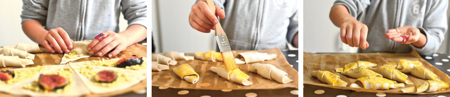 - Étalez un peu de mélange fromage- pesto sur chaque morceau de pâte, puis déposez une rondelle de figue sur la partie large. Roulez les croissants.