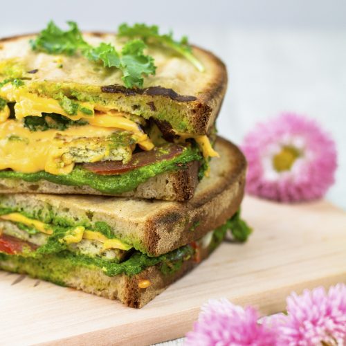 - Assemblez les croques : sur tranche de pain tartinée de pesto, glissez 2 à 3 tranches de tomate, des feuilles de chou kale, une tranche de tofu mariné, une tranche de fromage et quelques feuilles de chou kale à nouveau.