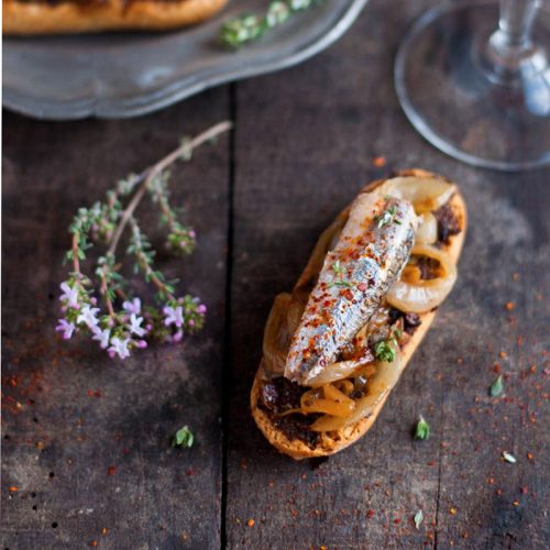 Plus doux que les anchois au sel, les anchois entiers à l’huile d’olive Phare d’Eckmühl se révèlent d’une grande délicatesse en bouche. Inspirée des cuisines niçoise, provençale et italienne, cette recette fera l’unanimité à l’apéritif ou en entrée. Elle associe une tapenade « express » maison, une compotée d’oignons au vinaigre balsamique, du thym, un soupçon de piment d’Espelette et les anchois entiers à l’huile d’olive. Léger et gourmand, l’ensemble peut être accompagné d’une salade de mesclun.