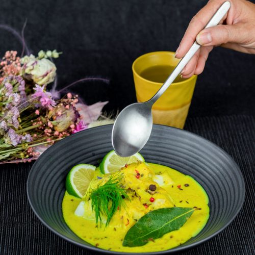 - Complétez avec l’eau et la feuille de laurier, laissez mijoter, puis déposez les 2 carrés de Sauce Curry Indien Madras. Versez le jus de citron et mélangez.