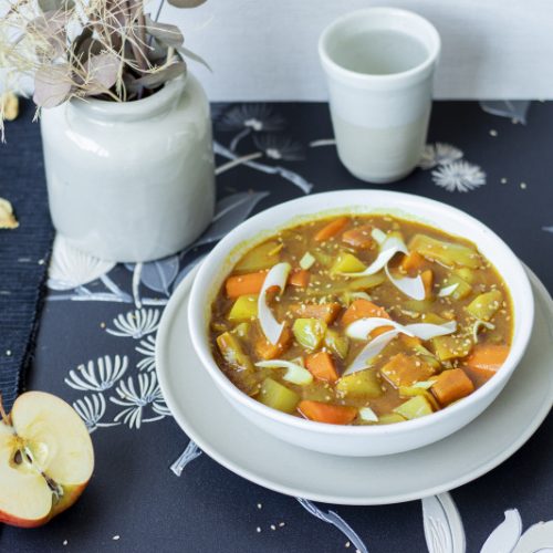 - En fin de cuisson, râpez la pomme au-dessus de la préparation et saupoudrez de graines de sésame.