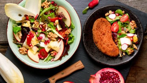 Escalopes croustillantes tomate basilic et jolie salade composée