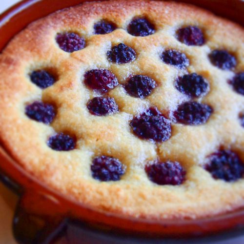 - Graissez un moule d’environ 25 cm de diamètre et versez la préparation à l’intérieur. Parsemez de mûres enfoncées à moitié.