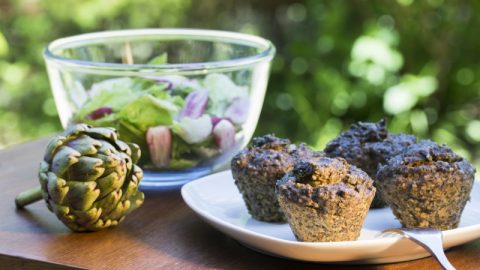 Muffins à la farine de graines de courge, olives vertes et artichauts au basilic