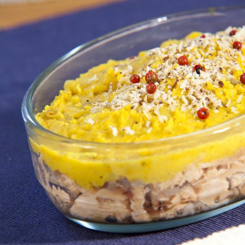 - Disposez le saumon émietté dans un plat préalablement huilé, recouvrez-le de purée.