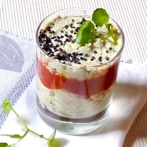 - Dressez les verrines en disposant successivement une couche de crème d’artichauts, une couche de crème de tomates et une dernière couche de crème d’artichauts.