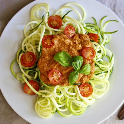 - Mettez tous les ingrédients dans le bol d’un blender (excepté les courgettes) et mixez jusqu’à obtention d’une crème homogène. Goûtez et ajustez l’assaisonnement si nécessaire.