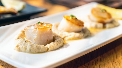 Saint-Jacques sur purée de châtaignes et petits fours chèvre Ronde de Thyms