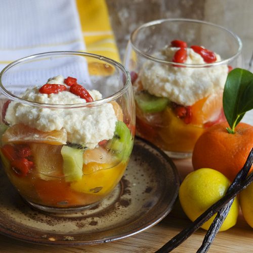 - Dans un saladier, mélangez les fruits avec les graines d’1/2 gousse de vanille (séparez la gousse en 2 et raclez l’intérieur d’1/2 gousse à l’aide de la lame d’un couteau pour en extraire les graines), puis ajoutez les baies de goji avec leur liquide de trempage et l’infusion de rooibos froide.