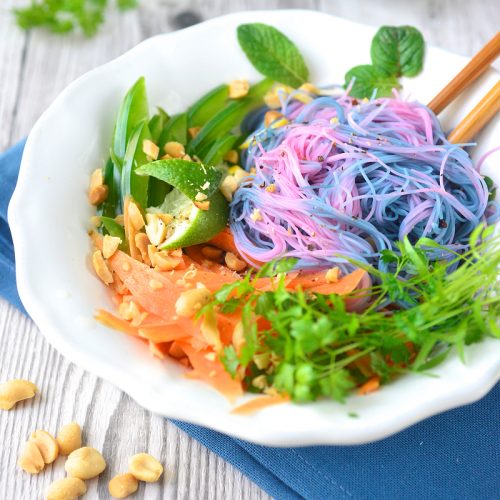 Voici une petite salade colorée que vous pourrez, au choix, déguster telle quelle ou préparer en rouleaux de printemps. Il vous suffit alors de prévoir des feuilles de riz et de laitue. L’effet bleu rose est impressionnant à réaliser, comme un tour de magie instantané, avec quelques gouttes de citron.
