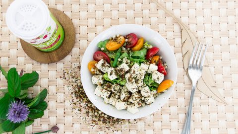 Salade de tofu et tomates cerises relevées avec Pep’s Paillettes salades et légumes