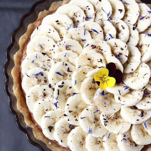 • Avant de servir (quelques heures, pas plus, car les bananes risquent de noircir), garnissez la tarte de fines rondelles de bananes bien mûres, tendres et savoureuses. Saupoudrez d’éclats de fèves de cacao cru et de fleurs comestibles. Pour les plus gourmands, servez avec une chantilly de coco ou un nappage chocolat !