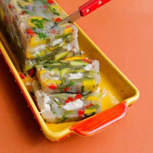 - Tapissez un moule à cake de film alimentaire. Déposez quelques fleurs et de la ciboulette, puis alternez les couches de poisson, de ciboulette, de fleurs et de légumes sautés. Versez délicatement la gelée à l’agar-agar en veillant à ce que le liquide s’immisce entre les ingrédients. Laissez refroidir puis prendre au minimum 3 heures au réfrigérateur.
