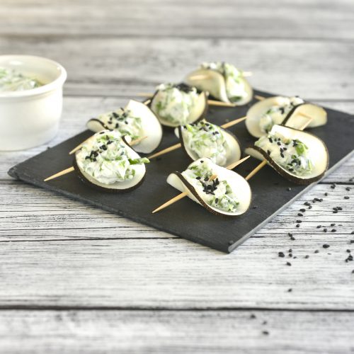 • Tranchez des rondelles fines à l’aide d’une mandoline, puis déposez un peu de préparation sur le dessus de chacune.