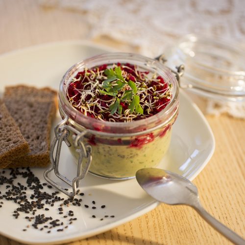 - Déposez une couche de crème de flageolets, puis, par-dessus, de caviar de betteraves et recouvrez de graines germées.