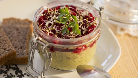 Verrines de crème de flageolets au sésame noir, caviar de betteraves rouges et graines germées