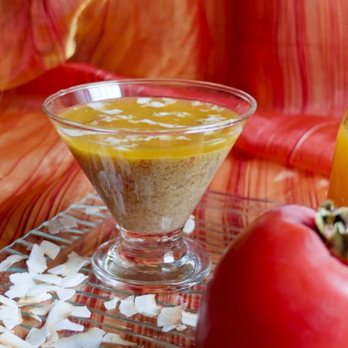 - Hors du feu, incorporez les baies égouttées et la chair des kakis au tapioca, puis répartissez cette préparation dans les verrines en lissant bien la surface.