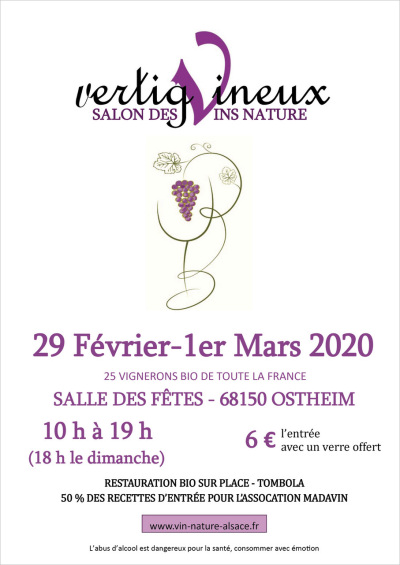 Le salon se tient à la salle des fêtes d’Ostheim 68150 (fléchage), facilement accessible par la N83, à 16 km de Sélestat et 10 km de Colmar ; horaires 10 à 19 heures (dimanche fermeture à 18 heures) ; entrée 6 Euros (verre de dégustation vertigVineux, tombola et don MADAVIN compris) ;